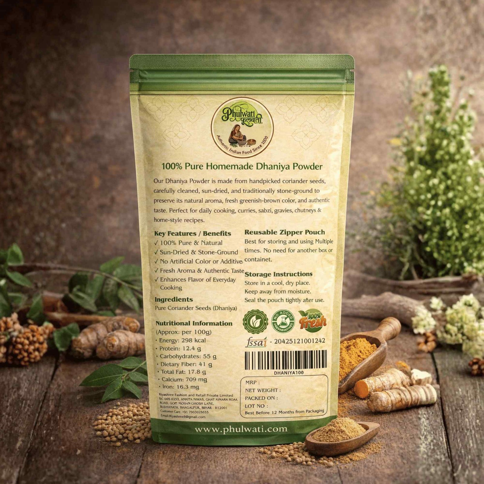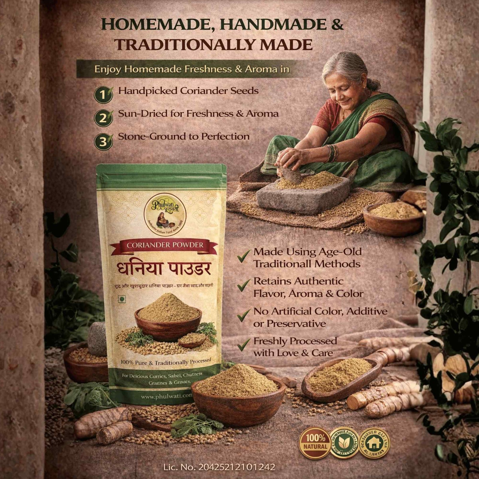 Made from premium quality coriander seeds, carefully cleaned, sun-dried and traditionally stone-ground to preserve natural aroma and flavor.
